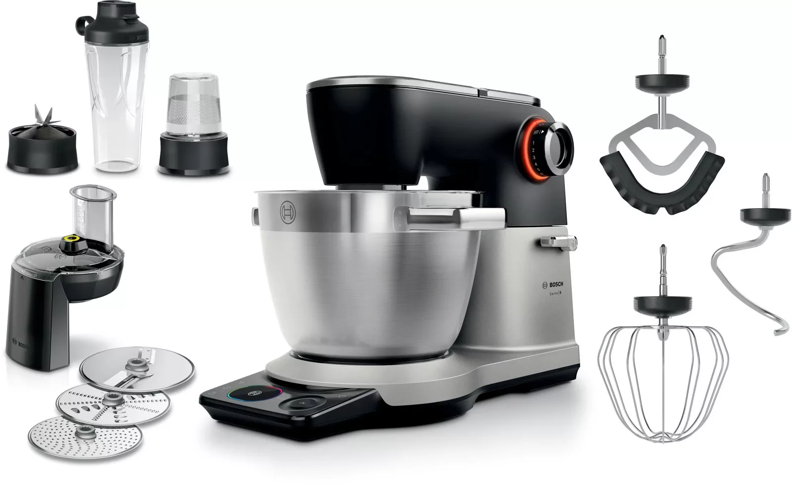 A Bosch MUMS8ZS22 (Serie 8) egy kompromisszummentes, prémium fémházas konyhai robotgép, amely a lenyűgöző 1800 W-os motorjával és a 6 literes nemesacél táljával a legnehezebb tésztákkal is könnyedén megbirkózik. A professzionális 3D PlanetaryMixing bolygóműves keverés és a beépített precíziós mérleg (amely a tálban és a gép tetején is mér) minden eddiginél pontosabb sütést tesz lehetővé. A színes TFT érintőkijelző és a beépített időzítő kényelmes, automatizált használatot biztosít. Ez a prémium felszereltségű változat a profi keverőszárak mellett egy sokoldalú aprító/szeletelő feltétet (különböző tárcsákkal) és egy praktikus ToGo turmixkelyhet is tartalmaz, így egyetlen géppel válthatja ki a konyhai kisgépek arzenálját.